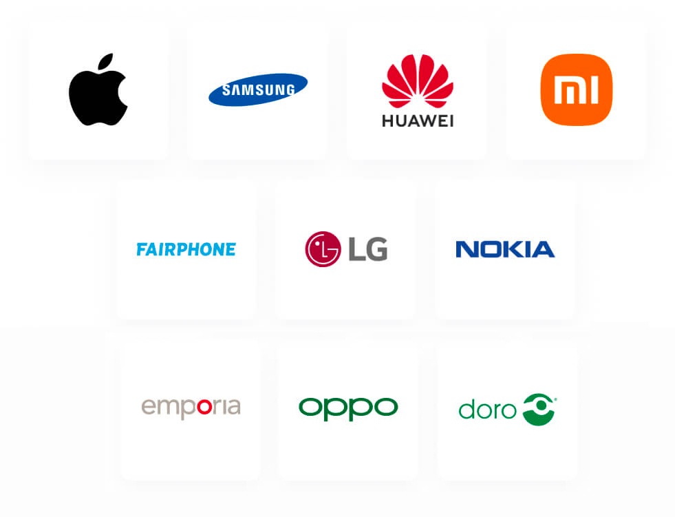 Apple, Samsung, Huawei, Xiaomi, Fairphone, LG, Nokia, Emporia, OPPO, Doro