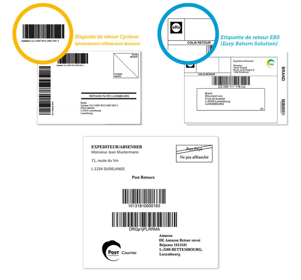 • Colis de retour avec une étiquette prépayée de type Cycleon, ERS ou Amazon retour
