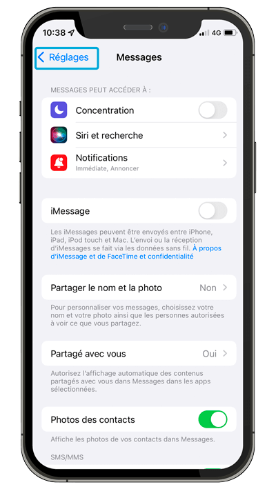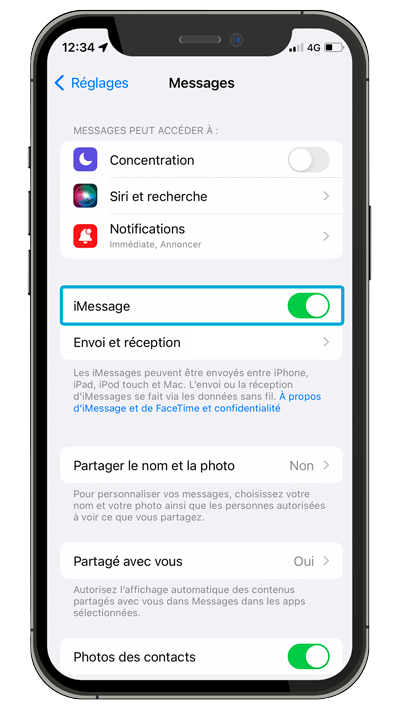 - Ensuite, sélectionnez Message et désactivez la fonction iMessage